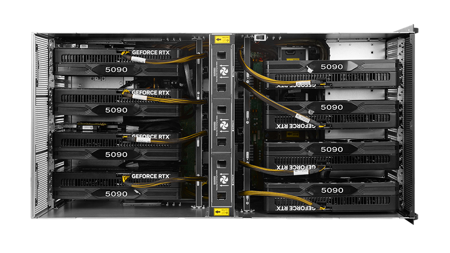 | GPU卡 | 直通8卡AI服务器风扇版:支持 8 张 600W 3 宽、3.3 宽、3.5 宽、 4.5 宽 RTX 5090 风扇卡或其他 600W 风扇卡 GPU,GPU 采用前后 4+4 分离上 下分风道布局,最大支持 GPU 宽度 89mm 直通8卡AI服务器涡轮版:支持 8 张 600W 2 宽、2.5 宽 RTX 5090 涡轮卡或其他 600W 涡轮卡 GPU,GPU 采用 8 卡后置并排集中风道散热布局, 最大支持 GPU 宽度 50mm |